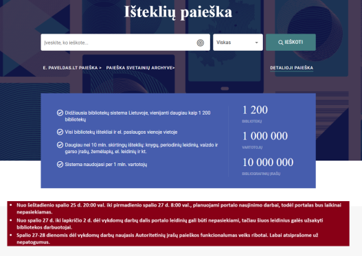 Nuo spalio 27 d. iki lapkričio 2 d. dėl vykdomų darbų dalis portalo leidinių gali būti nepasiekiami, tačiau šiuos leidinius galės užsakyti bibliotekos darbuotojai.