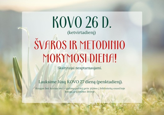 Informuojame, kad rytoj, kovo 26 d. (ketvirtadienį), bibliotekoje vyks švaros ir metodinio mokymosi diena, todėl lankytojai nebus aptarnaujami.
